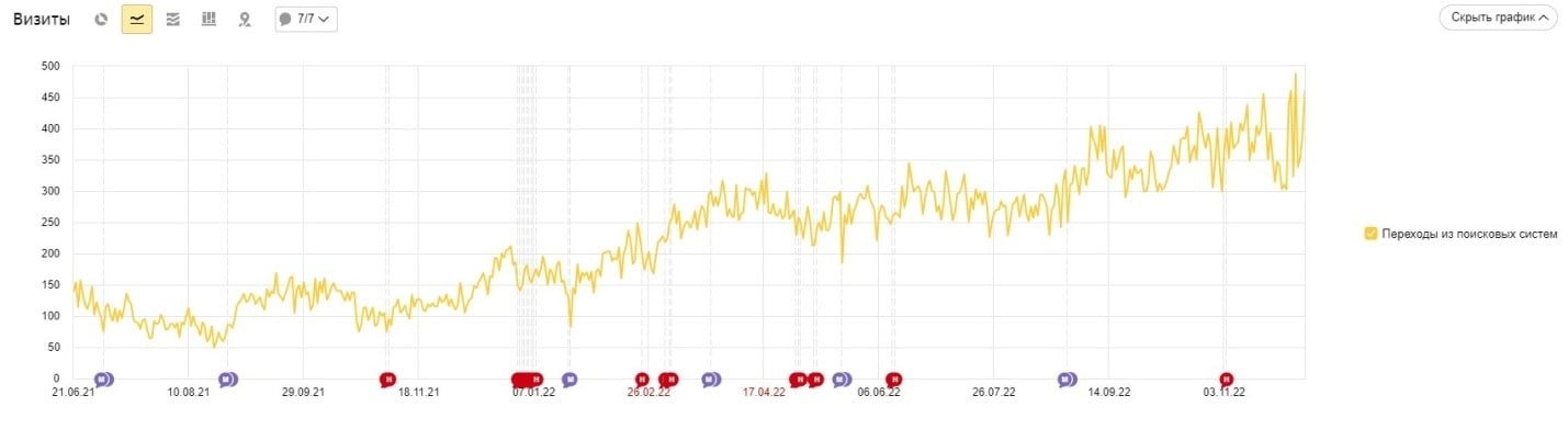 Ежедневный трафик на сайт с начала работ увеличен со 150 до 500 визитов. Продолжается работа над выводом в топ НЧ и СЧ запросов брендового трафика на сайт.